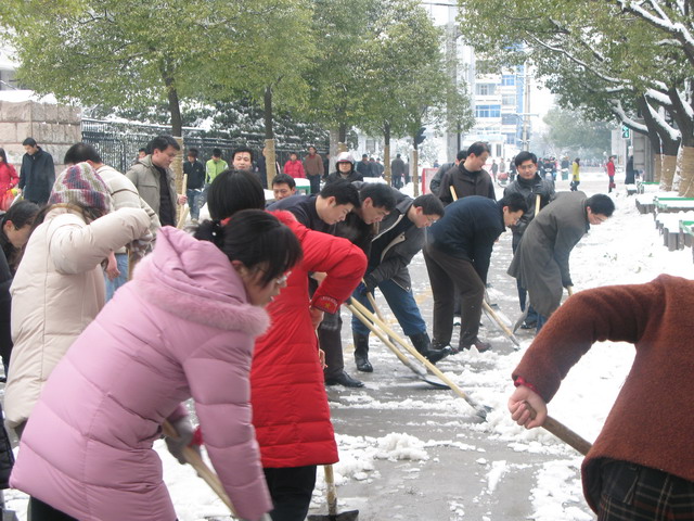 公司全體員工不顧天寒地凍,熱火朝天的在街頭揮鍬鏟雪,迅速清除了公司院內、門前及榮事達大道市府廣場至壽春路段交通主干道的路面積雪,保證了公司出入車輛及門前交通干道的行車安全,受到市民的贊許。